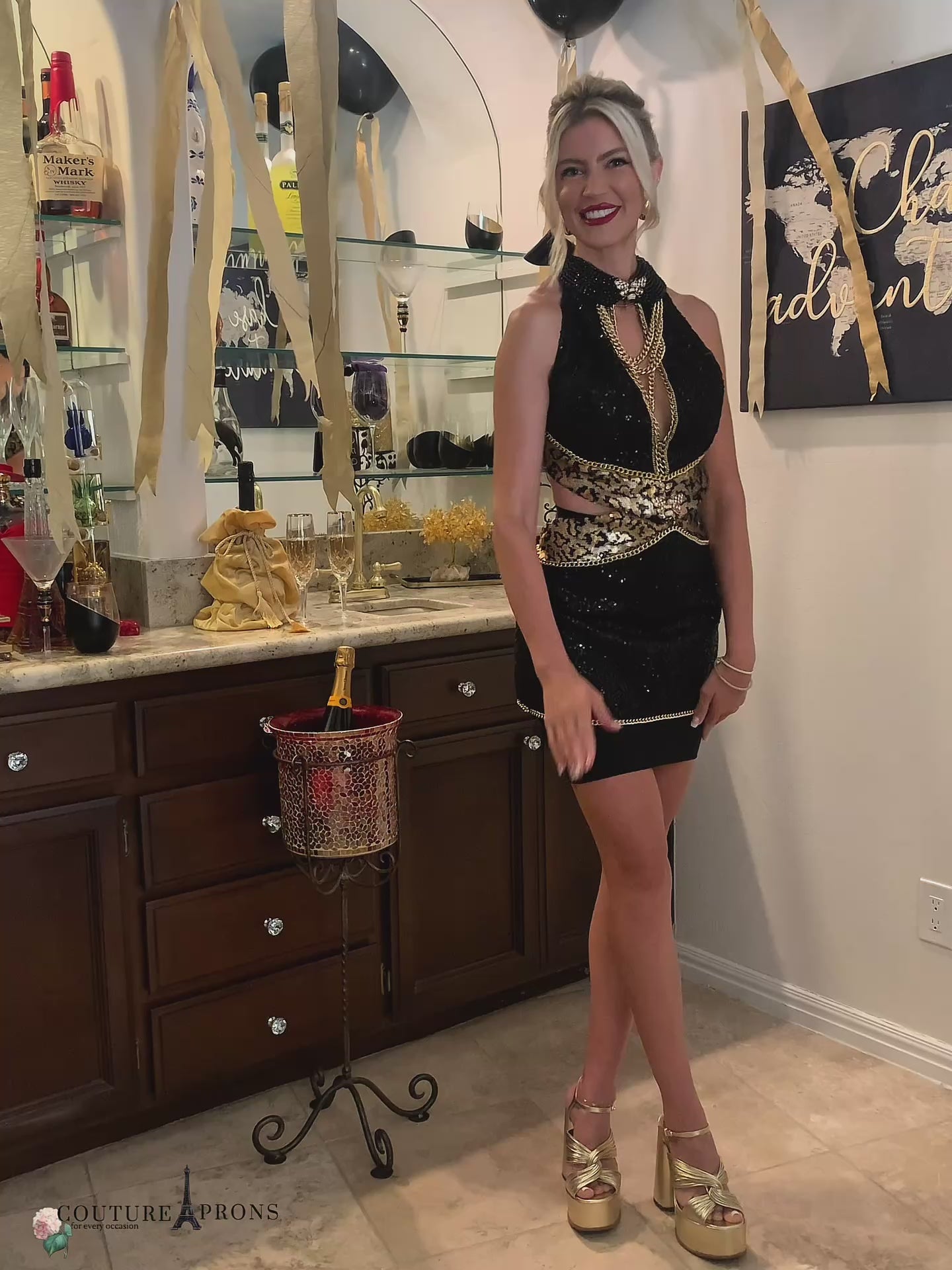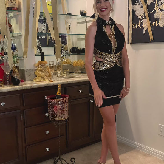 Being Beautiful and Sassy inspires Love and Romance - Bee Gucci is all that and much more. A black sequin mini dress with leopard sequin accent trim makes this apron/dress so outstanding. Embellished with gold chain and honeybee accents to hyper this apron into the Luxury Market. Double-face satin ribbon ties and open in back for the sassy appeal. Detachable Chain Necklace.