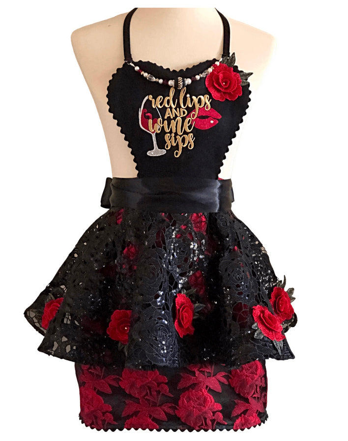 Red Wine Sips makes for the perfect Holiday Gift Apron for the Lady who Loves doing Girl Friend Night. Sipping and reminiscing in this retro Old Hollywood Styled glamorous Apron - We've added Rose Appliques on a Black Rose Sequin Lace Peplum over a Rose Brocade underskirt with side pockets. Beautiful professional embroidery with rose applique, crystals and a handmade detachable necklace. Fully Lined - Handcrafted in the USA - Lovely Apron from every angle, surely you will be the Hostess of the Mostess in this Apron.
