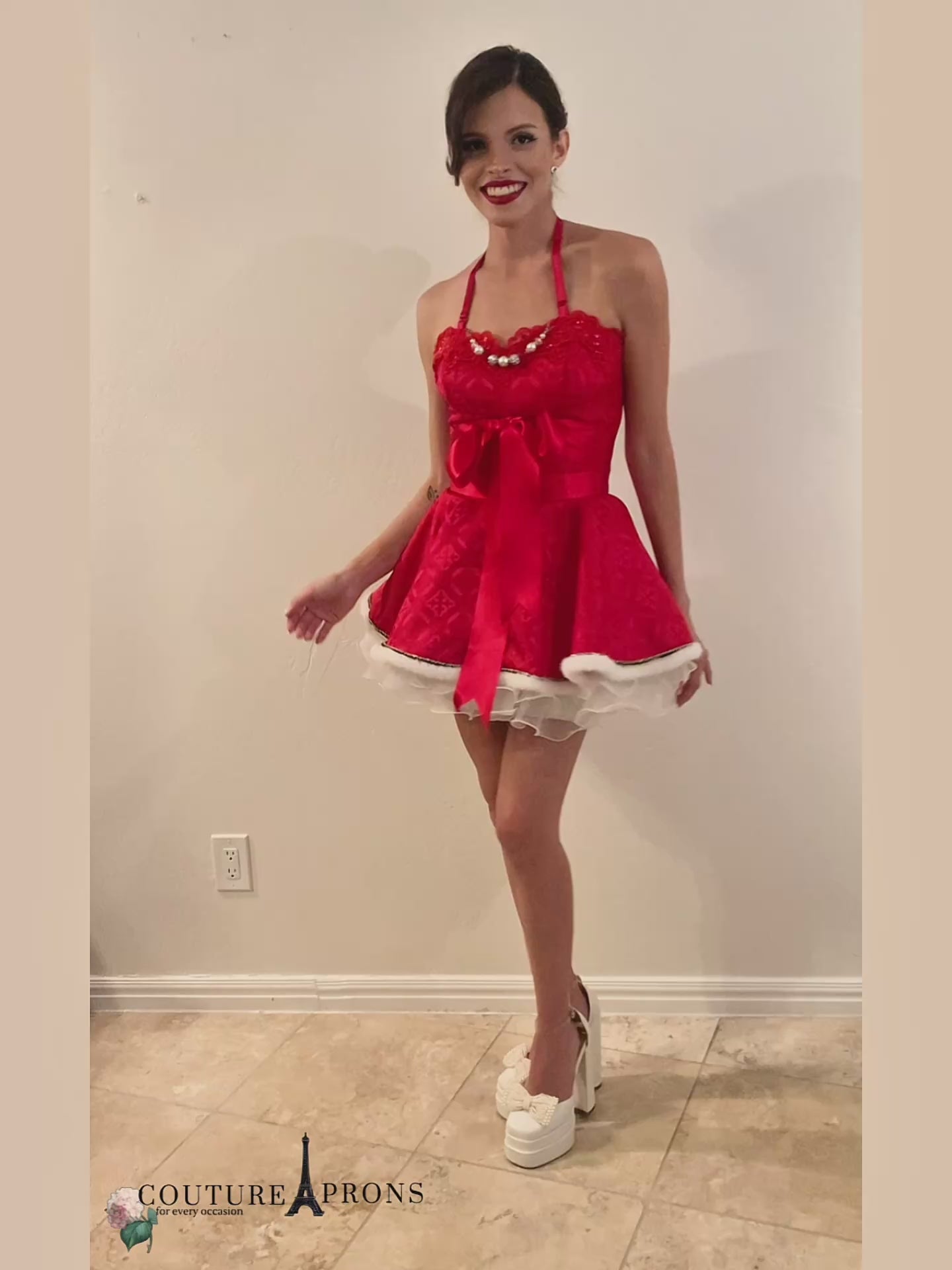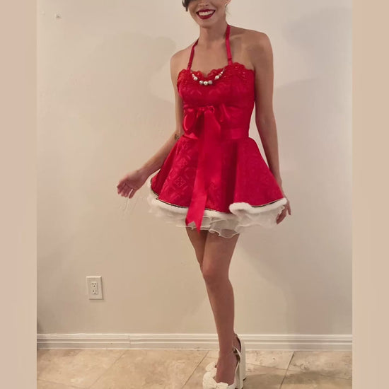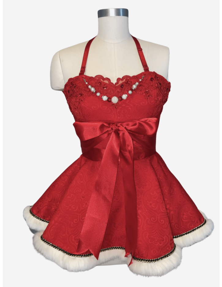 In the realm of festive enchantment, kindle the yuletide spirit with the Santa Baby Apron. Delight in the art of gift wrapping, savoring hot cocoa, indulging in specialty drinks, and crafting cookies. At Couture Aprons, we champion the art of hosting in grandeur. Crafted from Italian Viscose Brocade, adorned with scalloped red lace, faux white fur, and graced with a ruffled organza underskirt for a touch of whimsy. Adorned with a bespoke detachable beaded necklace, tailored exclusively for Santa Baby. This masterpiece is fully lined, featuring a double-faced satin ribbon that dances in a crisscross at the back, culminating in a lavish bow at the front.