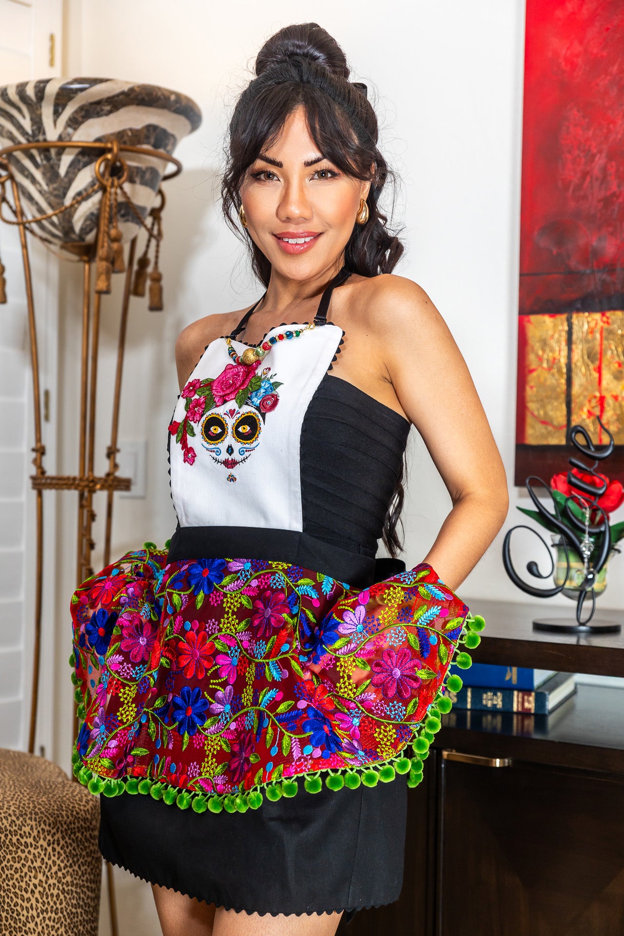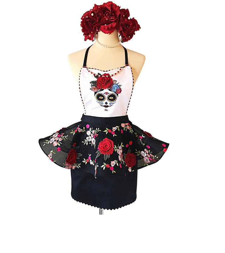 The Rose of Frieda is Beautiful and Fancy. Made for 100% Cotton Fabrics and Tulle Embroidered Net. Embellished with Red Rose appliques and a handcrafted detachable necklace. Double face Satin Ties - fully Lined - We've added a surprise - Deep side Pockets for your cell phone. 100% Cotton Thread Embroidery of a sugar skull.